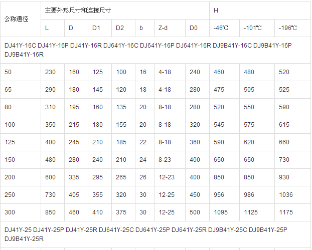 低溫截止閥的型號有DJ41Y-16、DJ41Y-16C、DJ41Y-16P、DJ41Y-25、DJ41Y-25P、DJ41Y-25R、DJ41Y-40、DJ41Y-40P、DJ41Y-40R、DJ641Y-16C、DJ641Y-25C、DJ641Y-40C、DJ641Y-16P、DJ641Y-25P、DJ641Y-40P、DJ641Y-16R、DJ641Y-25R、DJ641Y-40R、DJ9B41Y-16C、DJ9B41Y-16P、DJ9B41Y-16R、DJ9B41Y-25C、DJ9B41Y-25P、DJ9B41Y-25R、DJ9B41Y-40C、DJ9B41Y-40R、DJ9B41Y-40P等。