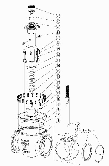 圖中數(shù)字注釋:1表示閥座墊片,2表示閥座,3表示閥體,4、10表示銷軸,5表示閥桿,6表示閥體,7表示閥蓋,8表示墊片,9表示閥蓋,11表示活接螺栓,12、14、21表示螺母,13、20表示螺柱,15比保濕填料墊,16表示填料,17表示填料壓蓋,18表示壓板,19表示支架,22表示導(dǎo)向螺釘,23表示推力球軸承,24表示閥桿螺母,25表示軸承壓蓋。