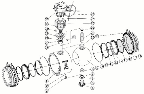 圖中標注數(shù)字解析:1表示球體,2、25表示軸襯,3表示密封圈,4表示閥座,5、9、22、31表示O型圈,6表示防火墊,7表示支撐圈,8、27表示彈簧,10、23表示注脂閥,11、17、21、32表示墊片,12表示閥蓋,13表示螺柱,14表示螺母,15、18、34表示螺釘,16表示螺塞,19表示球,20表示底蓋,24表示閥體,26表示排泄閥,28表示鍵,29表示閥桿,30表示止推軸承,33表示上閥桿座,35表示填料,36表示填料壓套,37表示壓板,38、39、41表示螺栓,40表示支架,42表示驅動結構。
